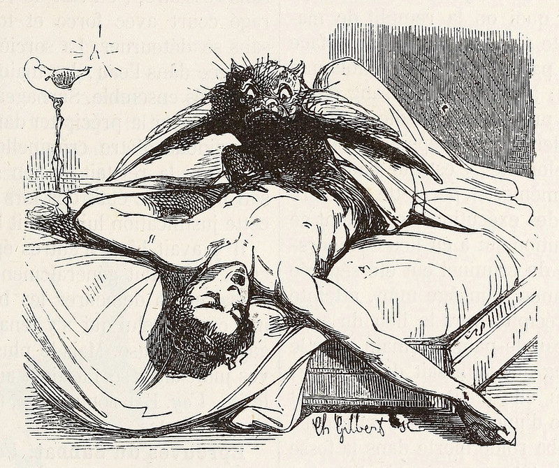 And then there is Ephialtes — a pug-faced, bird-winged, wild-eyed little gremlin perched atop the chest of a man, like Fuseli’s Nightmare — who Collin de Plancy describes in just a single sentence, explaining that he derives from the “Greek name for the nightmare . . . a kind of incubus that stifles sleep.”