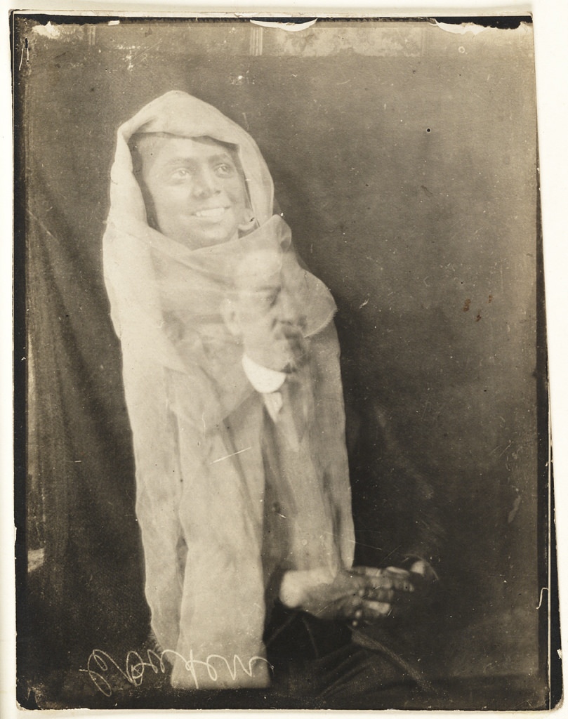 This remarkable collection of photographs was unearthed in a Lancashire antiquarian bookshop by one of the curators at the National Media Museum. Known as “spirit photographs”, they were taken by a controversial medium called William Hope. Born in 1863 in Crewe, Hope started his working life as a carpenter, but in 1905 became interested in spirit photography after capturing the supposed image of a ghost while photographing a friend. He went on to found and lead a group of six spirit photographers known as the Crewe Circle. Following World War I, support for the group, and demand for its services, grew as the grieving relatives of those lost to the war sought a means of contacting their loved ones. By 1922 Hope had moved to London where he established himself as a professional medium. The work of the Crew Circle was investigated on various occasions, the most famous of these taking place in 1922, when the Society for Psychical Research sent Harry Price to investigate. Price collected evidence that Hope was substituting glass plates bearing ghostly images in order to produce his spirit photographs. Later the same year Price published his findings, exposing Hope as a fraudster. However, many of Hope’s most ardent supporters spoke out on his behalf, the most famous being Sir Arthur Conan Doyle who wrote The Case for Spirit Photography, in response to Price’s claims of fraud. Hope continued to practice, despite his exposure, until his death in 1933.